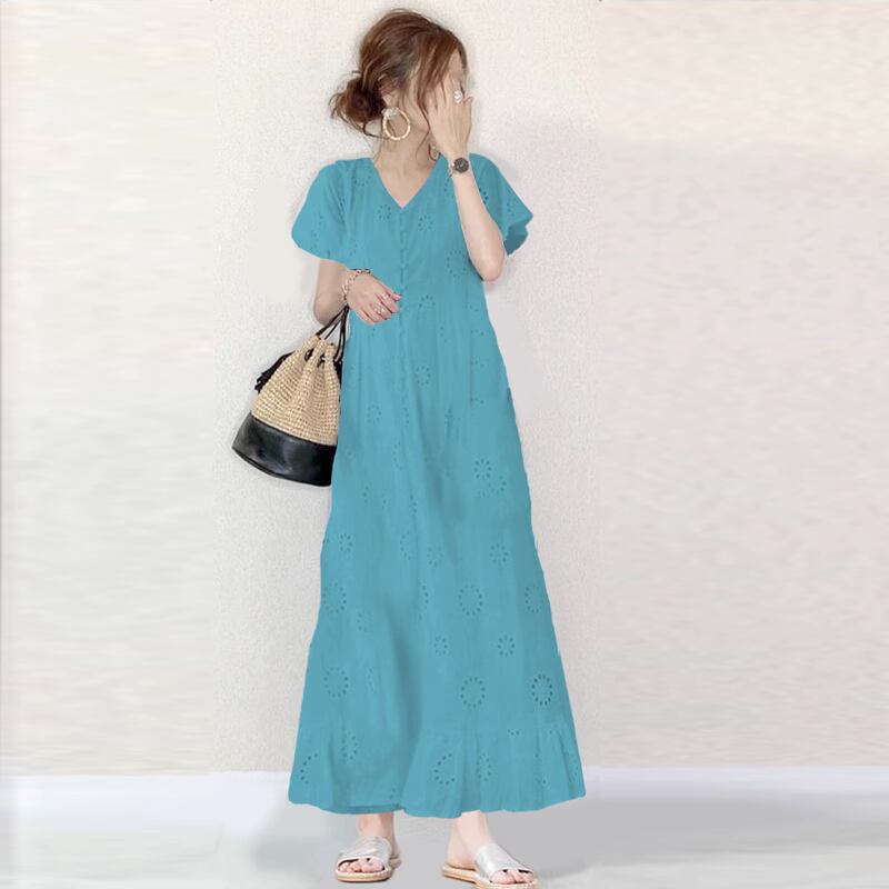 ワンピース カラードレス マキシ丈ドレス 袖あり 半袖 パフスリーブ ラウンドネック Aラインスカートレースボタン ハイウエスト かわいい きれいめ シンプル 大人 上品 おしゃれ かっこいい ラブリー キュート セクシー エレガント フォーマル 大人 上品 無地 20代 30代 レディース ママ お出かけ イベント 美容師 メイクアップアーティスト ネイリスト アパレルスタッフ 美容部員 フリーランス 夏 パーティー ホワイト ブラック 空色 M L