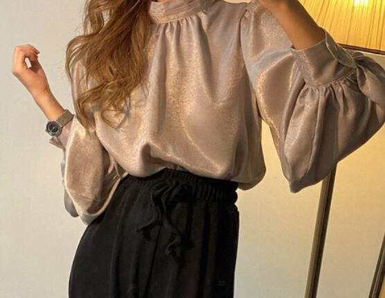 華やかさと上品さが共存する、光沢生地ハイネック長袖トップスのご紹介です。華やかなボリューム袖と光沢が特徴で、大人スタイルにぴったりなアイテムです。シンプルなデザインながらも、存在感のある一枚で、コーディネートを華やかに仕上げます。