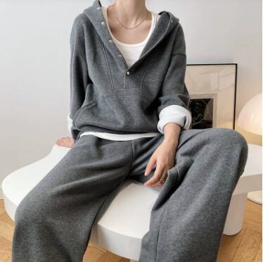 セットアップルームウェアのご紹介です。この商品は、シンプルなデザインが特徴で、上下セットでの販売となっております。ルーズなシルエットとフード付きで、カジュアルながらもおしゃれでかっこいいスタイルを演出することができます。大人っぽくボーイッシュな雰囲気を楽しみたい方や、スポーティーなスタイルがお好みの方にもおすすめです。