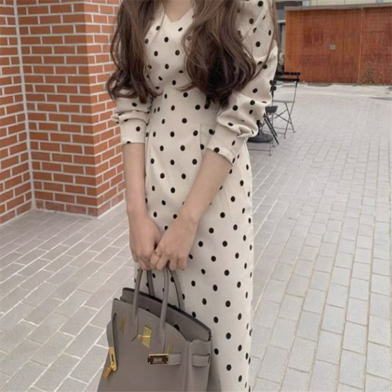 ドレス ロングドレス ロング ロング丈 袖あり 長袖 Vネック ハイウエスト かわいい きれいめ シンプル 大人 上品 おしゃれ かっこいい 大人女子 こなれ感 ラブリー キュート ガーリー 個性的 クール モード系 セクシー エレガント 主役級 存在感 エレガント 大人 上品 おしゃれ ドット柄 水玉 20代 30 レディース お出かけ パーティー イベント アパレルスタッフ フリーランス 韓国系 ファッション スタイル 秋 お呼ばれ S M L 白 ホワイト