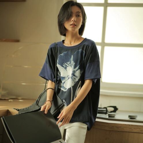 トップス カットソー Tシャツ 大人可愛い きれいめ 上品 おしゃれ エレガント 存在感 フォーマル 花柄 レディース OL 通勤 お出かけ 普段使い ファッション コーデ スタイル トレンド インスタ映え 大人カラー 着回し フリーサイズ ブルー 美容師 メイクアップアーティスト ネイリスト アパレルスタッフ 美容部員 エステティシャン コーディネーター 通訳 事務職 総合職 システムエンジニア マーケター OL フリーランス