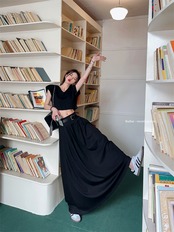 最もトレンド感のあるセットアップが登場しました!シンプルでありながら、個性的なデザインが魅力のカットソーとロングスカートのセットアップです。トップスは短めのカットソーで、襟なしVネックが女性らしい印象を与えます。スカートはセミフレアのAラインで、プリーツが美しいシルエットを作り出します。白色のトップスとブラックのスカートで、洗練されたコーディネートができます。大人可愛いスタイルを演出し、美容師やアパレルスタッフ、エステティシャンなど、さまざまな職業の方におすすめです。日常のカジュアルなシーンから、ちょっとしたオフィスカジュアルまで幅広く活躍してくれます。一度お試しください。