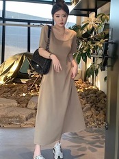 自由な着こなしを楽しめるシンプルワンピース登場!大人可愛いデートワンピースです。フレアのAラインが女性らしいシルエットを描き、スクエアネックが品のある印象を与えます。袖ありの半袖デザインなので、肩や二の腕の気になる部分をカバーしながら涼しげな印象を演出します。さらにロング丈なので、どんなボトムスとも相性抜群。シンプルなデザインなので、カジュアルからきれいめ、レトロまで幅広いスタイリングに対応します。また、コーディネートに迷った時の切り札としても活躍する優れものです。