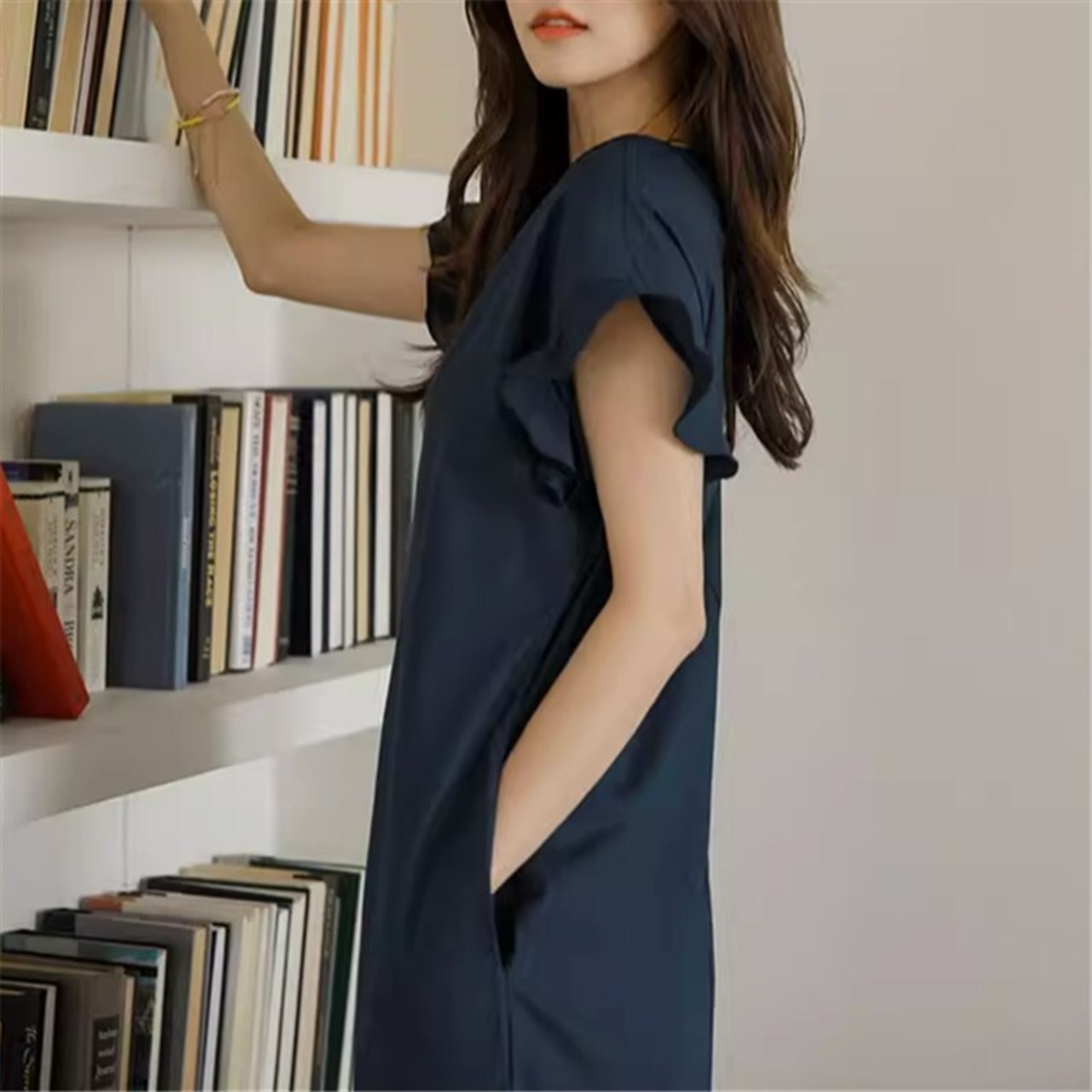 ワンピース ロングスカート ロング ロング丈 袖あり 半袖 トランペットスリーブ ラウンドネック フリル かわいい きれい カジュアル 大人 上品 おしゃれ お洒落 かっこいい レトロ 大人女子 こなれ感 主役級 甘い 無地 夏 20代 30代 レディース 休日 美容師 メイクアップアーティスト ネイリスト アパレルスタッフ 美容部員 エステティシャン コーディネーター 通訳 事務職 総合職 システムエンジニア マーケター OL フリーランス 韓国 ファッション S M L XL 紺 イエロー