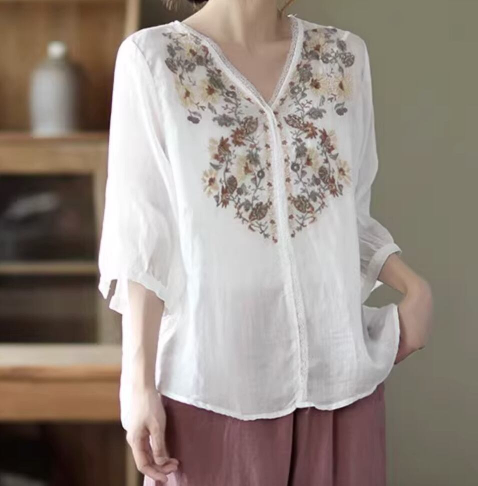 レトロな雰囲気と上品な刺繍が魅力のシャツです。Vネックがデコルテを美しく引き立て、女性らしい華やかさを演出します。さまざまなシーンに合わせてコーディネートがしやすく、オフィスやデート、お出かけや女子会など、様々な場面で活躍するアイテムです。
