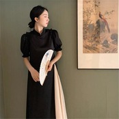 ワンピース ロングスカート ロング ロング丈 袖あり 半袖 パフスリーブ スタンドカラー Aライン ハイウエスト かわいい 大人可愛い きれいめ シンプル カジュアル 大人女子 こなれ感 主役級 無地 夏 20代 30代 レディース ビジネス OL デート 女子会 美容師 メイクアップアーティスト ネイリスト アパレルスタッフ 美容部員 エステティシャン コーディネーター 通訳 事務職 総合職 システムエンジニア マーケター OL フリーランス 韓国 ファッション コーデ S M L XL ブラック