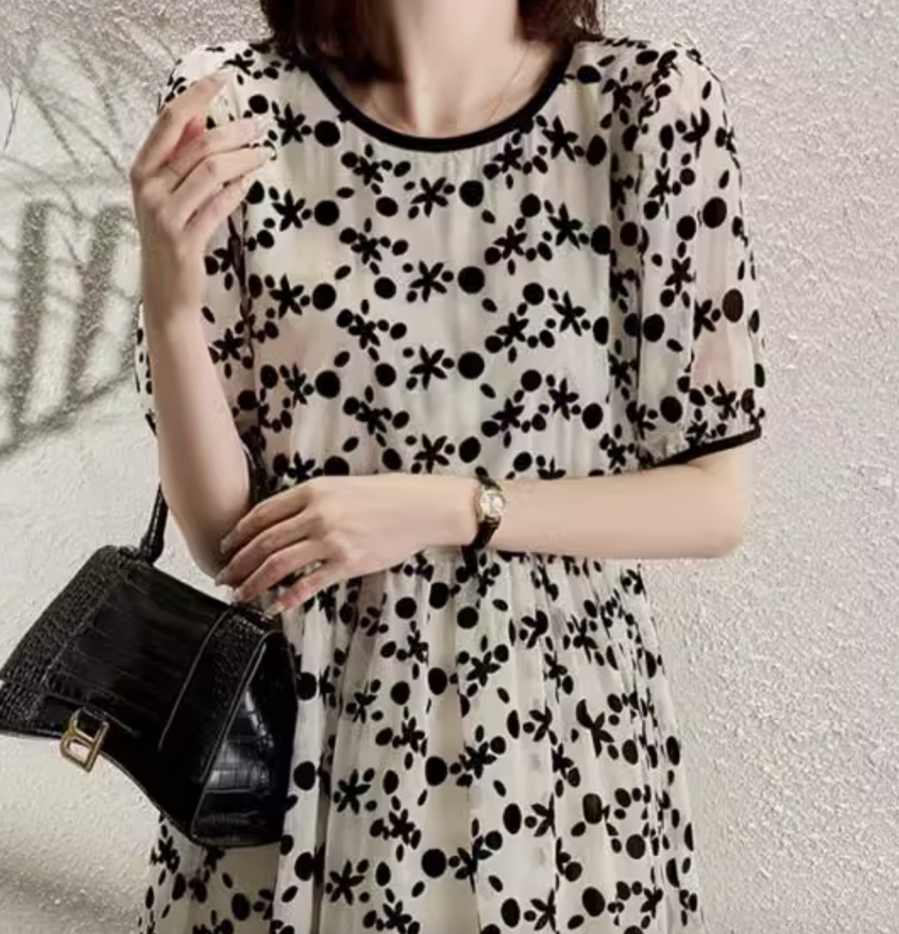 レトロな雰囲気漂うフレアワンピース。ミモレ丈で上品な印象を与え、一目で存在感を感じさせるデザインです。どんなシーンにも合わせやすく、かわいさと大人っぽさを兼ね備えた一着です。