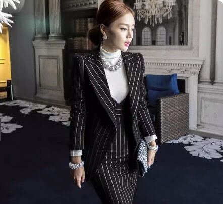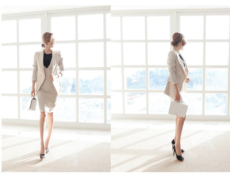 シャープな印象を与えるピンストライプ柄のワンピーススーツです。Vネックとタイトなシルエットが、大人可愛い雰囲気を演出します。ひざ丈で上品さもあり、オフィスやビジネスシーンにもぴったりです。